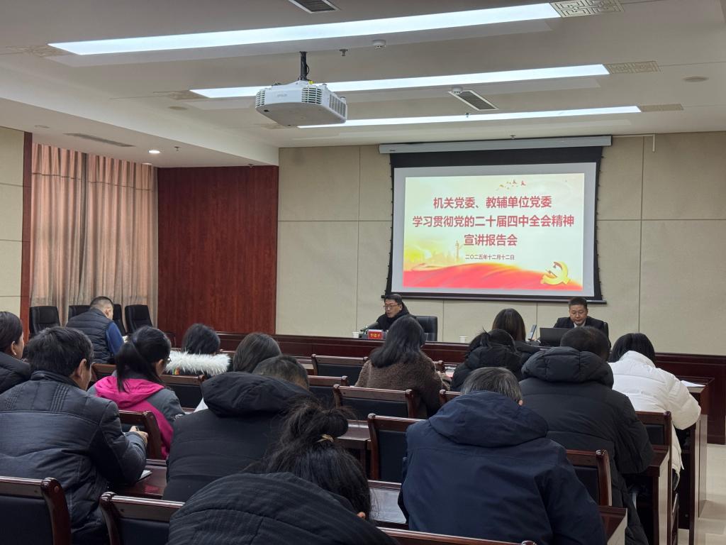 12月12日下午,机关党委、教辅单位党委在勤业楼A108会议室举行党的二十届四中全会精神宣讲报告会。学校党的二十届四中全会精神宣讲团成员、马克思主义学院教师杨永兴为机关和教辅单位党员干部做了“乘势而上、接续奋斗,为推进中国式现代化建设贡献力量”的宣讲报告。机关党委、教辅单位党委60余名党员干部参加了宣讲报告会。报告会由机关党委书记李建平主持。